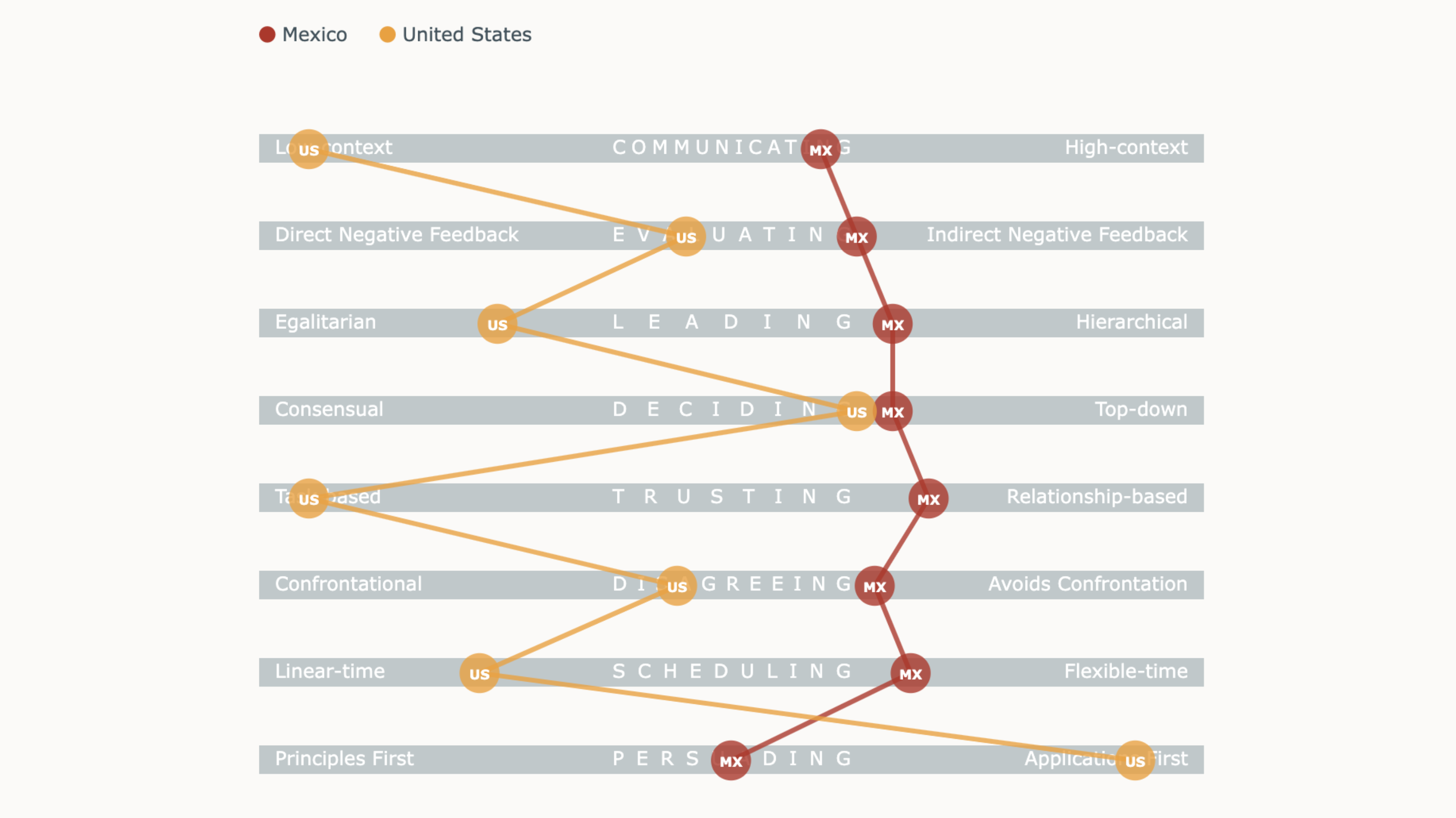 De cualquier modo, independientemente de si tu empresa ofrece este recurso o no, también te podría aconsejar estudiar un poco sobre los estilos de trabajo de diferentes culturas. En su libro, The Culture Map, Erin Meyer hace un análisis de las diferencias que existen en las culturas de trabajo entre países de todo el mundo. Por ejemplo, aquí está una tabla que mapea las diferencias entre las culturas de trabajo de México y Estados Unidos: